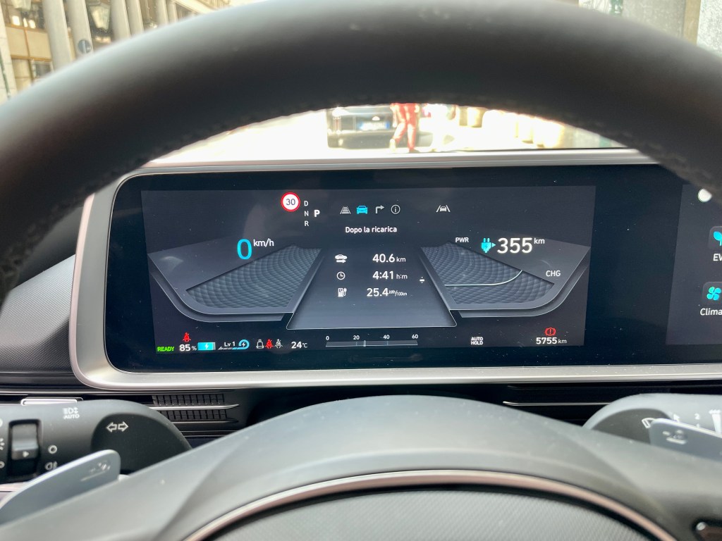 Si parte. Con l’85% di batteria residua il computer di bordo segnala 355 km di percorrenza. Inserendo la freccia sul quadro compare subito la visuale registrata dalla telecamera laterale, mentre appena si è in movimento si notano sul parabrezza le informazioni principali riportate dall’head-up display.